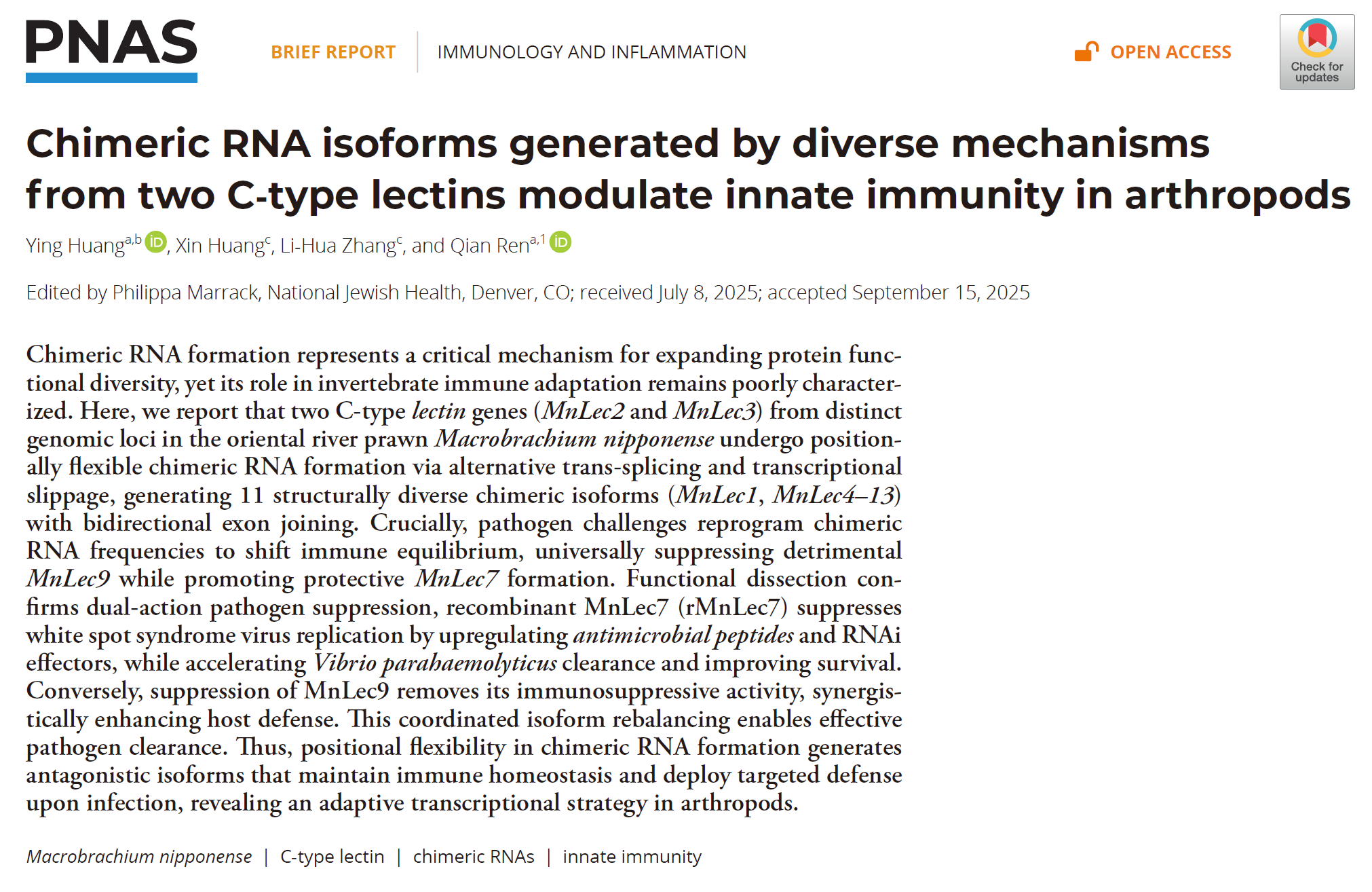 近日,我校海洋科学学院海洋水产养殖团队在甲壳动物先天免疫调控机制研究方面取得重大突破,相关研究成果《Chimeric RNA isoforms generated by diverse mechanisms from two C-type lectins modulate innate immunity in arthropods》发表于国际顶级综合性期刊《Proceedings of the National Academy of Sciences of the United States of America》(PNAS)。我校海洋学院任乾教授为唯一通讯作者,合作者包括河海大学黄颖副教授、南京师范大学黄欣副教授与研究生张利花。我校气候系统预测与变化应对全国重点实验室为第一单位。
