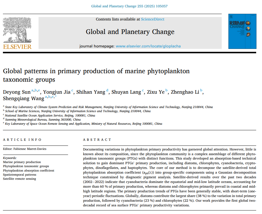 近日,我校海洋遥感团队孙德勇教授课题组在海洋浮游植物类群初级生产力遥感领域取得新进展。研究成果以《Global patterns in primary production of marine phytoplankton taxonomic groups》为题发表于地球科学领域顶级期刊《Global and Planetary Change》(中科院一区Top)。第一作者为孙德勇教授,合作者包括我校王胜强教授、国家卫星海洋应用中心贾永君研究员、2020级硕士研究生杨诗晗、国家卫星海洋应用中心郎姝燕副研究员、2025级博士研究生叶子绪和2021级博士研究生李正浩。我校气候系统预测与变化应对全国重点实验室为第一单位。
