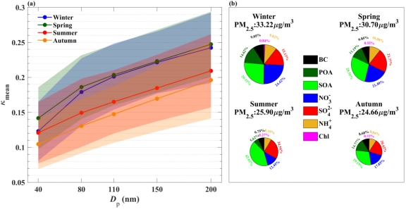 图2.(a)不同季节不同粒径气溶胶的平均吸湿性参数,误差带表示标准偏差;(b)不同季节PM2.5化学组分质量浓度及组分占比(Zhang et al., 2025)