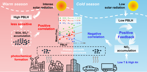图1. 边界层高度与PM2.5化学组分关系的季节对比机制示意图(Xu et al., 2025)