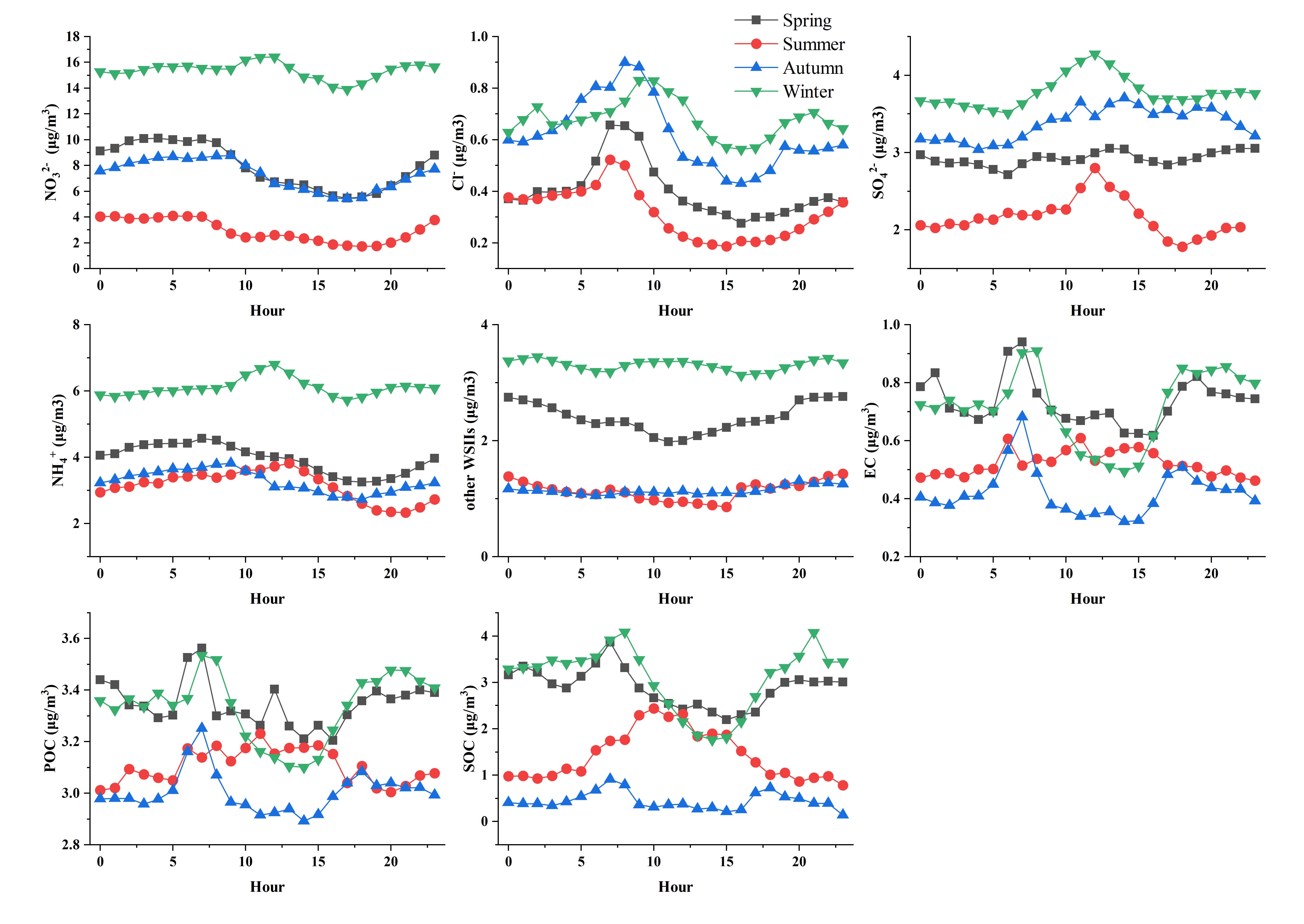 嘉兴地区不同季节各物种质量浓度的日变化