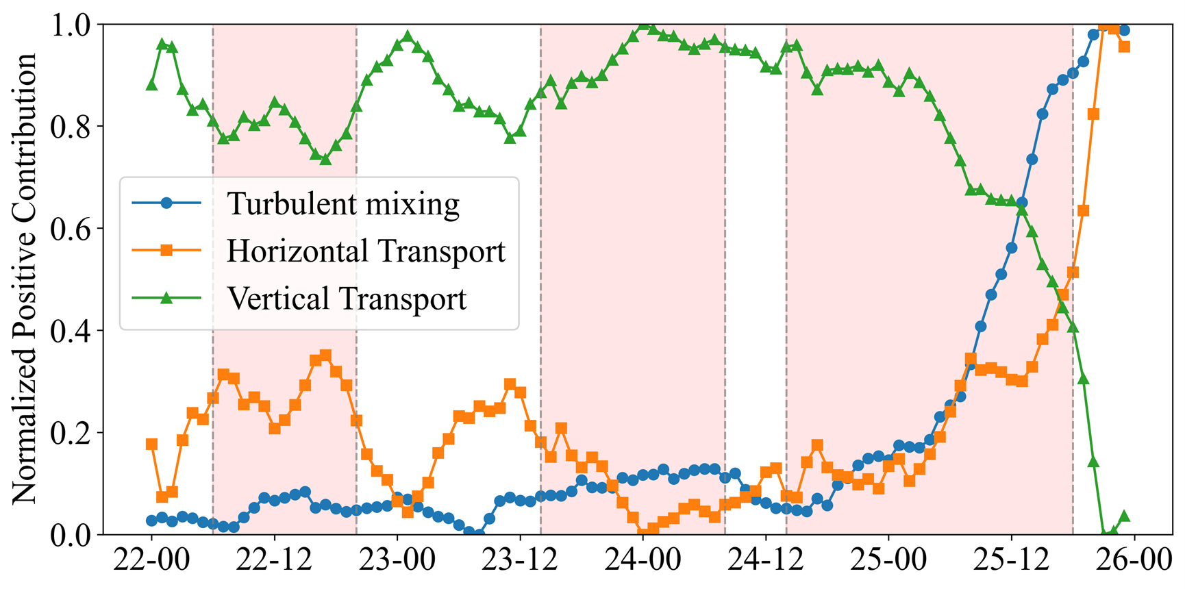 图2 该归一化时间序列展示了三种动力学过程(水平输送、垂直输送和湍流混合)对珠江三角洲地区臭氧污染的贡献。虚线将整个过程划分为三个不同时期:以水平输送和下沉输送为主的时期(时期I)、下沉输送增强的时期(时期Ⅱ)以及湍流混合增强的时期(时期Ⅲ)。