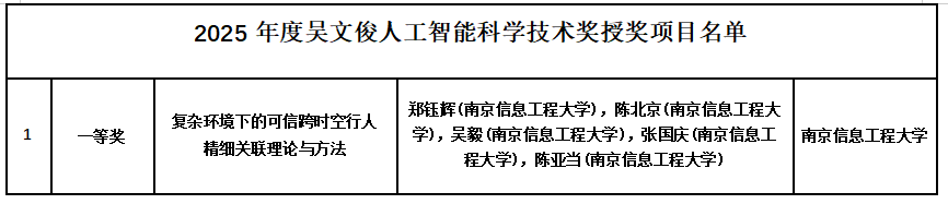 近日,2025 年度吴文俊人工智能科学技术奖评选结果正式公布,我校作为唯一完成单位申报的项目“复杂环境下的可信跨时空行人精细关联理论与方法”(完成人:郑钰辉、陈北京、吴毅、张国庆、陈亚当)凭借突出的理论创新与应用价值,荣获自然科学奖一等奖,实现了学校在人工智能领域重要奖项上的突破。江苏省仅两所高校获自然科学奖一等奖。
