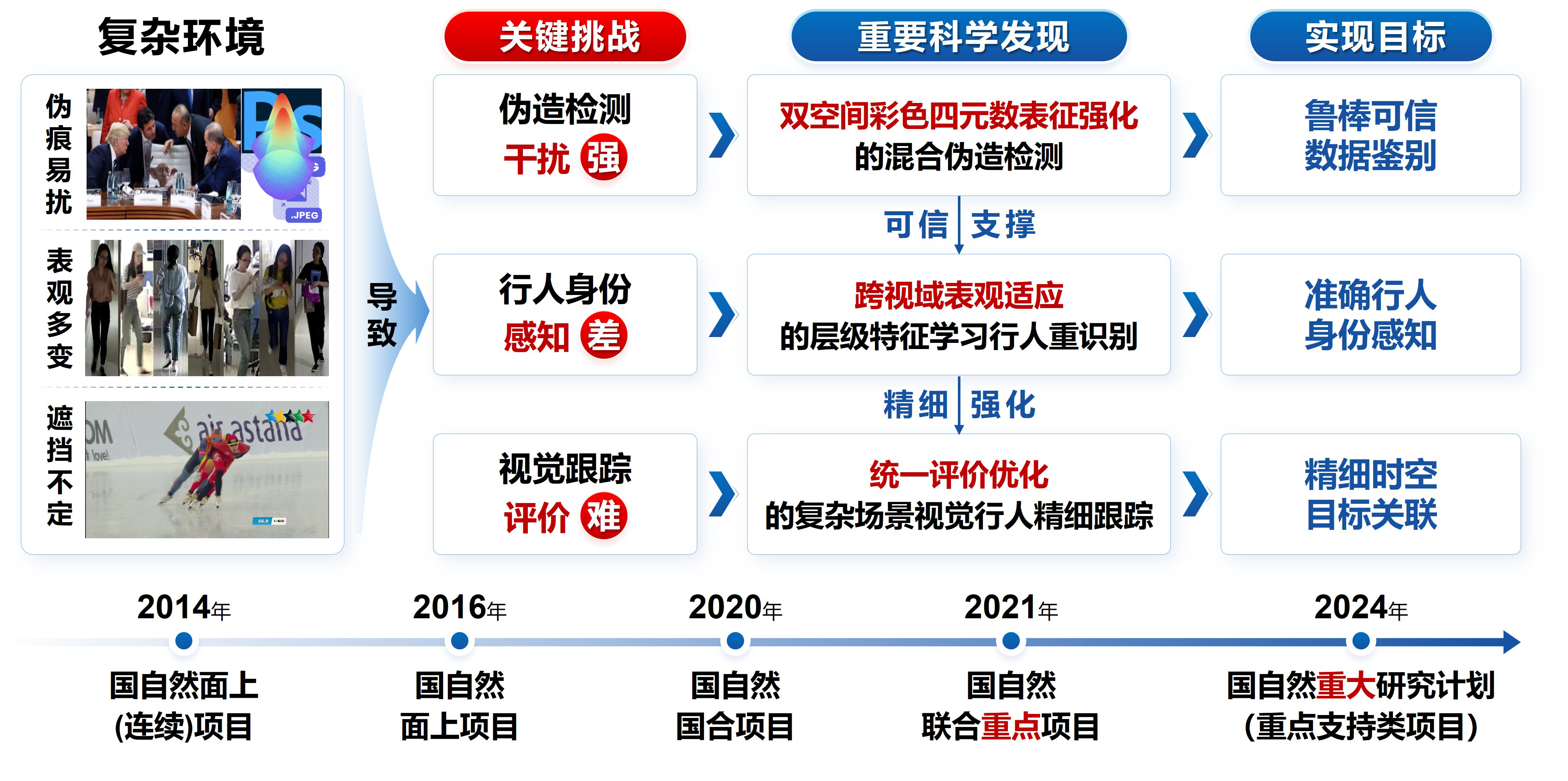 团队长期从事社会视觉感知计算研究。在国家重大、重点项目等课题的持续支持下,针对跨时空行人关联技术面临混合伪造检测稳健性弱,行人身份感知力差、时空轨迹关联度低的瓶颈挑战,围绕复杂环境下的可信跨时空行人准确感知与精细关联,系统深入地开展了混合伪造鲁棒检测、表观适应行人重识别、目标精细跟踪研究,构建了从可信数据鉴别到行人身份感知,再到像素级活动轨迹关联的层次递进精细关联理论框架与方法体系(具体见图1)。相关成果已在平安城市建设、生态环境监测等领域得到了成功应用。